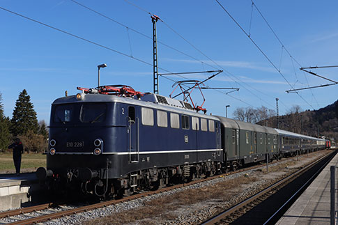 Classic Courier DRC 1798 bei Zugkreuzung in Eschenlohe. Das Bahnpostmuseum ist als erster Wagen hinter der 110 228 (E 10 228) gereiht.