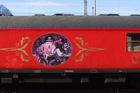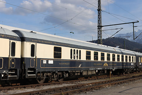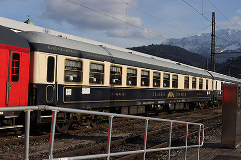 Classic Courier DRC 1799 in der Zwischenabstellung im Bahnhof Garmisch-Partenkirchen. Hinter der Lok sind die Party-, Speise- und Salonwagen des Classic Couriers eingereiht. Das Bahnpostmuseum ist bei der Abfahrt in Garmisch am Zugende (hier nicht mehr sichtbar).
