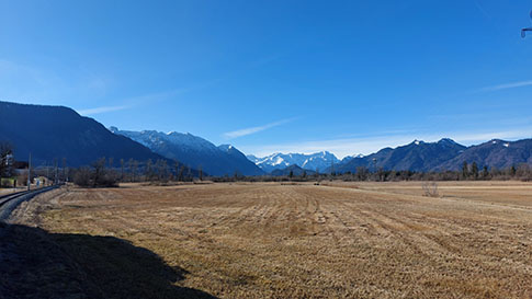 Wir nähern uns dem Ziel: Blick aus dem Zug bei Ohlstadt übers Murnauer Moos in Richtung Loisachtal.