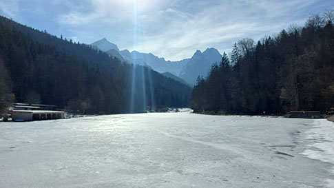 Blick über den Rießersee zum Zugspitzmassiv.