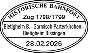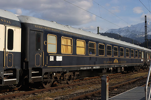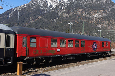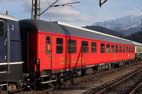 Classic Courier DRC 1799 in der Zwischenabstellung im Bahnhof Garmisch-Partenkirchen. Hinter der Lok sind die Party-, Speise- und Salonwagen des Classic Couriers eingereiht. Das Bahnpostmuseum ist bei der Abfahrt in Garmisch am Zugende (hier nicht mehr sichtbar).