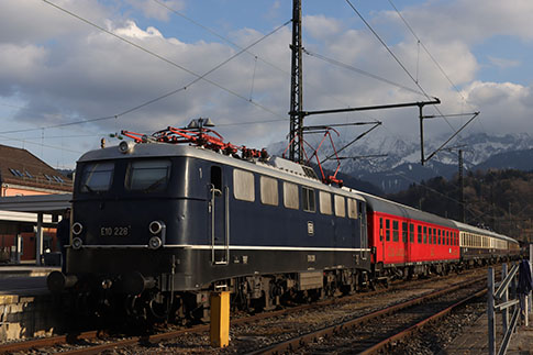 Classic Courier DRC 1798 bei Zugkreuzung in Eschenlohe. Das Bahnpostmuseum ist als erster Wagen hinter der 110 228 (E 10 228) gereiht.