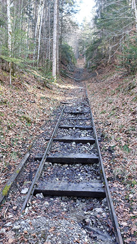 Schienen im Wald: Reste des ehemaligen Schrägaufzuges mit denen Bob und Sportler vom Ziel hinauf zum Startplatz gebracht wurden.