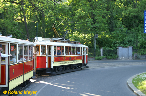 ...unser historischer Straßenbahnzug mit zwei Beiwagen